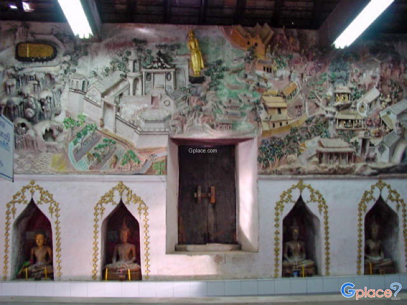 - ผนังวิหารด้านบนเป็นภาพจิตรกรรมฝาผนังลักษณะแตกต่างจากทั่วไป คือ เป็นปูนปั้นลวดลายนูนแสดงเรื่องเกี่ยวกับพระพุทธประวัติ ผนังวิหารด้านล่างโดยรอบมีช่องเจาะเป็นซุ้มประดิษฐานพระพุทธรูป
