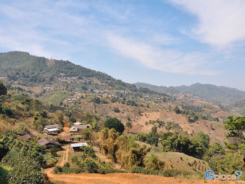 พระบรมธาตุเจดีย์ศรีนครินทราสถิตมหาสันติคีรี บนยอดดอยสูงสุดของดอย ห่างจากหมู่บ้านประมาณ 4 กิโลเมตร สร้างเพื่อถวายเป็นพระราชกุศลแด่สมเด็จย่า ตัวเจดีย์เป็นแบบล้านนาประยุกต์ บนฐานสี่เหลี่ยมลดชั้น สูงราว 30 เมตร ประดับกระเบื้องสีเทา เนื่องจากมีขนาดที่ค่อนข้างใหญ่และอยู่สูงสุดทำให้มองเห็นได้แม้จะอยู่ไกล