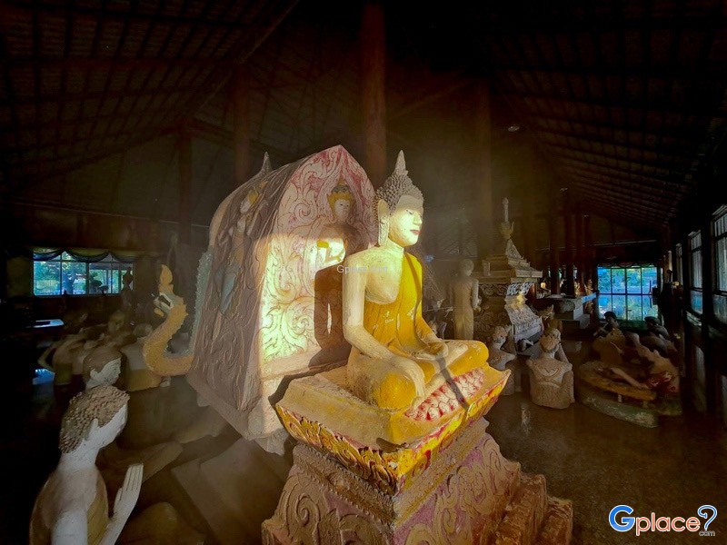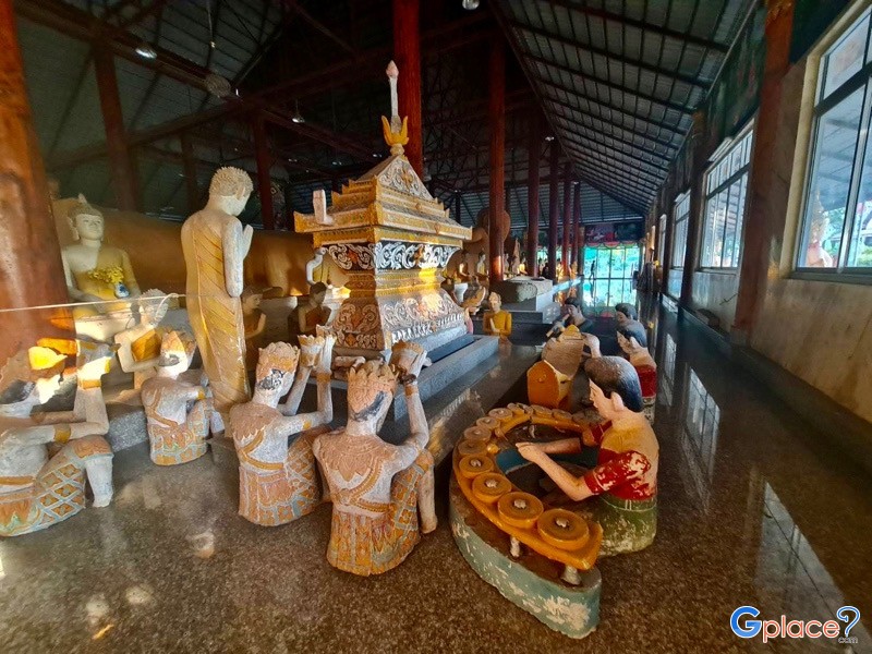 ด้านหน้าองค์พระนอนมีประติมากรรมรูปพระสงฆ์และพุทธสาวกเรียงยาวอยู่ พื้นที่บริเวณปลายพระบาทมีประติมากรรมบอกเล่าเรื่องราาวเกี่ยวกัยนรก และภายในวิหารยังมีประติมากรรมบอกเล่าเรื่องราวทางพระพุทธศาสนาอีกเป็นจำนวนมากด้วย