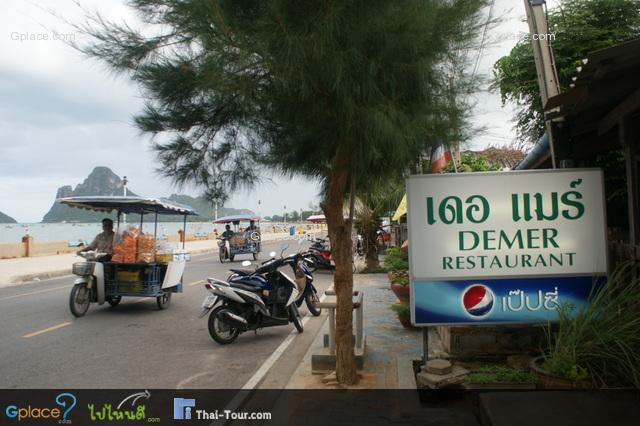 ร้านอาหารริมทะเลตั้งอยู่บนเนิน เขาตะเกียบบริการอาหารทะเลสดๆ บรรยากาศดีมากโดยเฉพาะยามเย็น